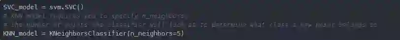 现在我们可以实例化这个模型。我们尝试使用两个分类器,一个支持向量分类器和一个k最近邻分类器: