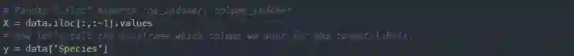 上面的切片符号会选择除最后一列(这是我们的分类,物种)之外的每一行和每一列。