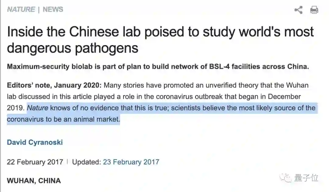 此外,《自然》杂志也翻出了2017年写的文章帮助辟谣,当时的文章介绍了武汉病毒研究所进行实验的危险性。针对近日“病毒来自实验室”的流言,编辑新加了一段按语: