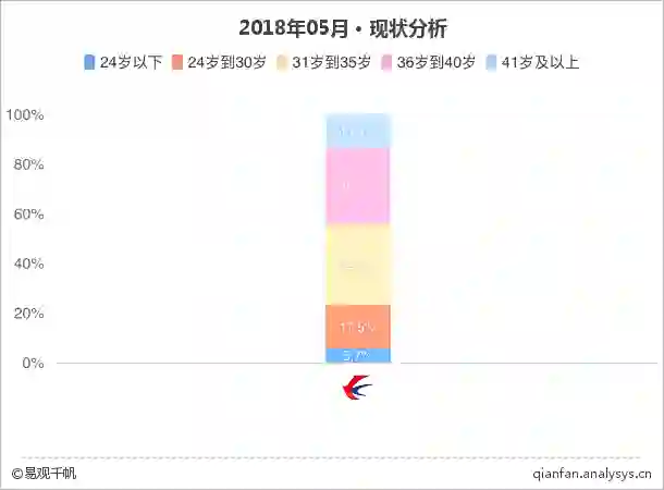 从用户年龄分布来看,东方航空的用户群体中,31岁到35岁用户占比最大,达到32.6%,其次为36-40岁,占比30.8%,第三位的是24-30岁,占比17.5%。
