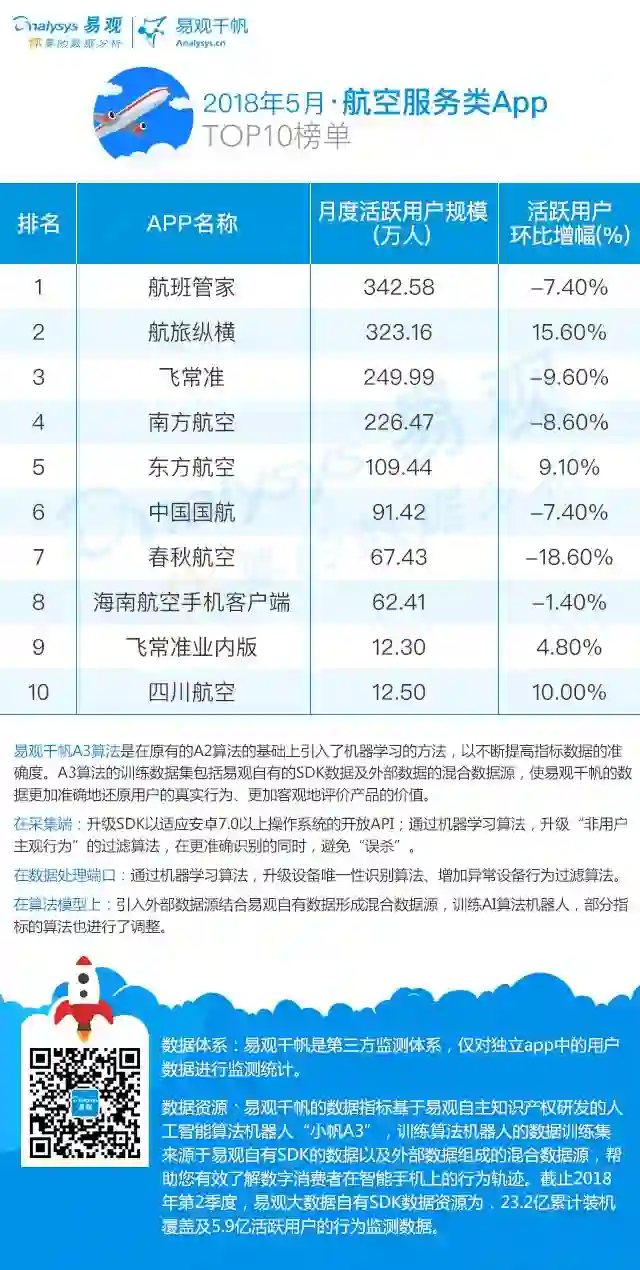 根据易观千帆监测数据,5月航空服务类应用TOP10榜单中,航班管家活跃人数继续位列榜首,但与排在第二的航旅纵横差距在逐步缩小。