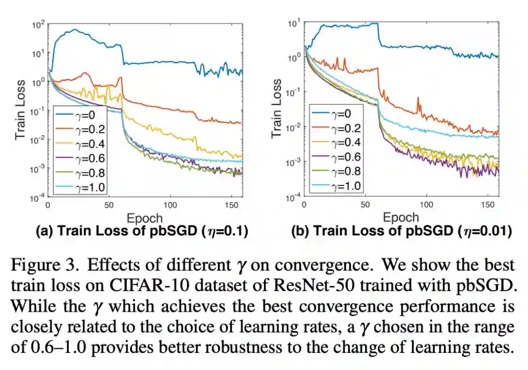 在实验中我们发现,超参数gamma的引入不仅可以加速收敛,同时可以改善对测试集准确率和收敛性的鲁棒性。(gamma=1.0时pbSGD变为了SGD算法)