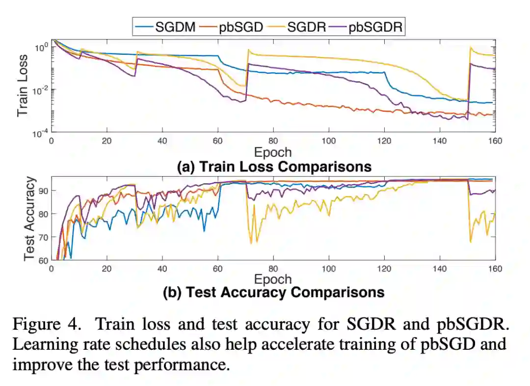 pbSGD只对梯度项做了改变,因此可以与其他优化方法很好的结合起来去进一步提升整体的性能。我们选择了restart的学习率策略用于对比实验,从结果中可以看出结合了学习率策略的pbSGD取得了更好的结果。