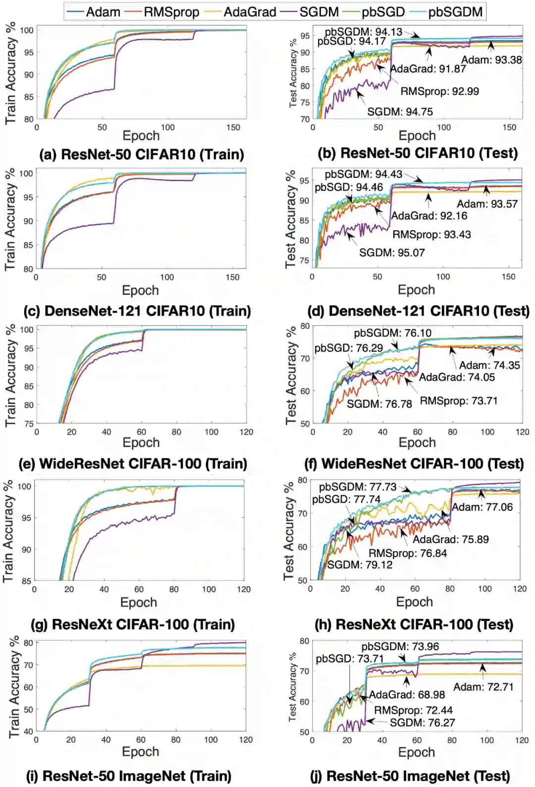 实验表明,提出的pbSGD和pdSGDM方法,可以实现与其他自适应梯度方法相比更快的收敛速度,以及与SGD方法的相近的泛化效果,同时该方法可以保持[1]中方法的优点,主要包括在初始迭代时的训练加速、算法性能对超参数的鲁棒性,以及有效地改善梯度消失问题。