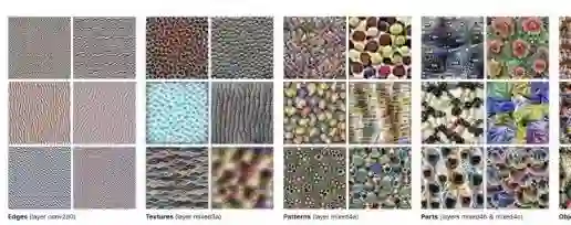 为了探秘 ImageNet,我们并非是要直接浏览数据集,而是要探究在 ImageNet 上训练的模型到底学到了什么。众所周知,在 ImageNet 上训练的深度神经网络特征有一个特点,即从网络的第一层到最后一层,特征逐渐由通用转向了特殊(由任务决定,https://arxiv.org/abs/1411.1792)。网络的较低层学习对诸如边缘这样的低级特征进行建模,而较高层则对图像较高级的概念进行建模,例如模式或物体(参见 AI 科技评论往期 CNN 特征可视化文章),如下图所示。重要的是,关于边缘、结构和物体的视觉组成等知识在很多计算机视觉任务中是通用的,这揭示了为何这些网络层可以被用于迁移学习。因此,一个类 ImageNet 数据集的关键属性是,要能促使模型学习那些可以推广到该问题领域中其它任务的特征。