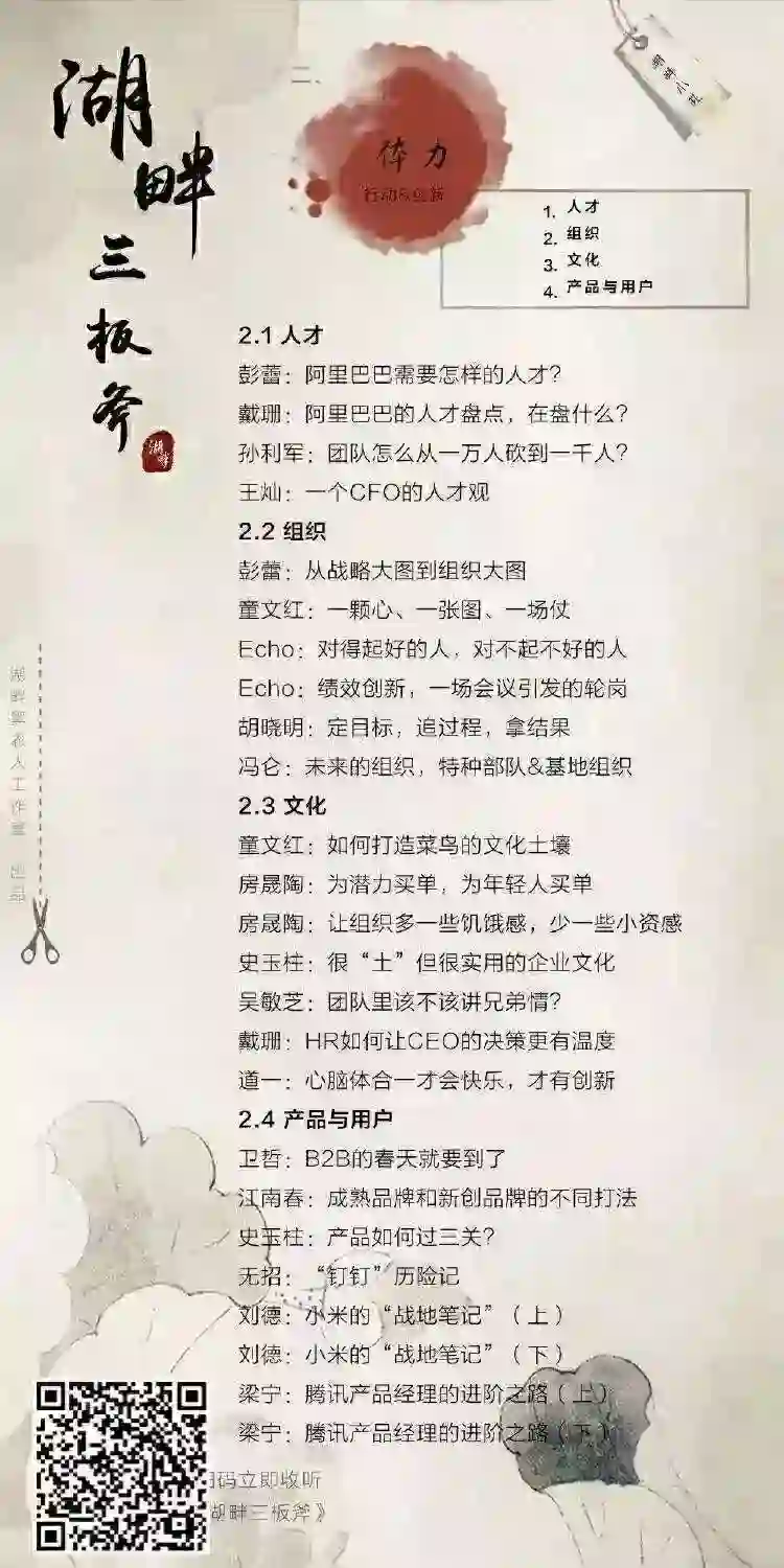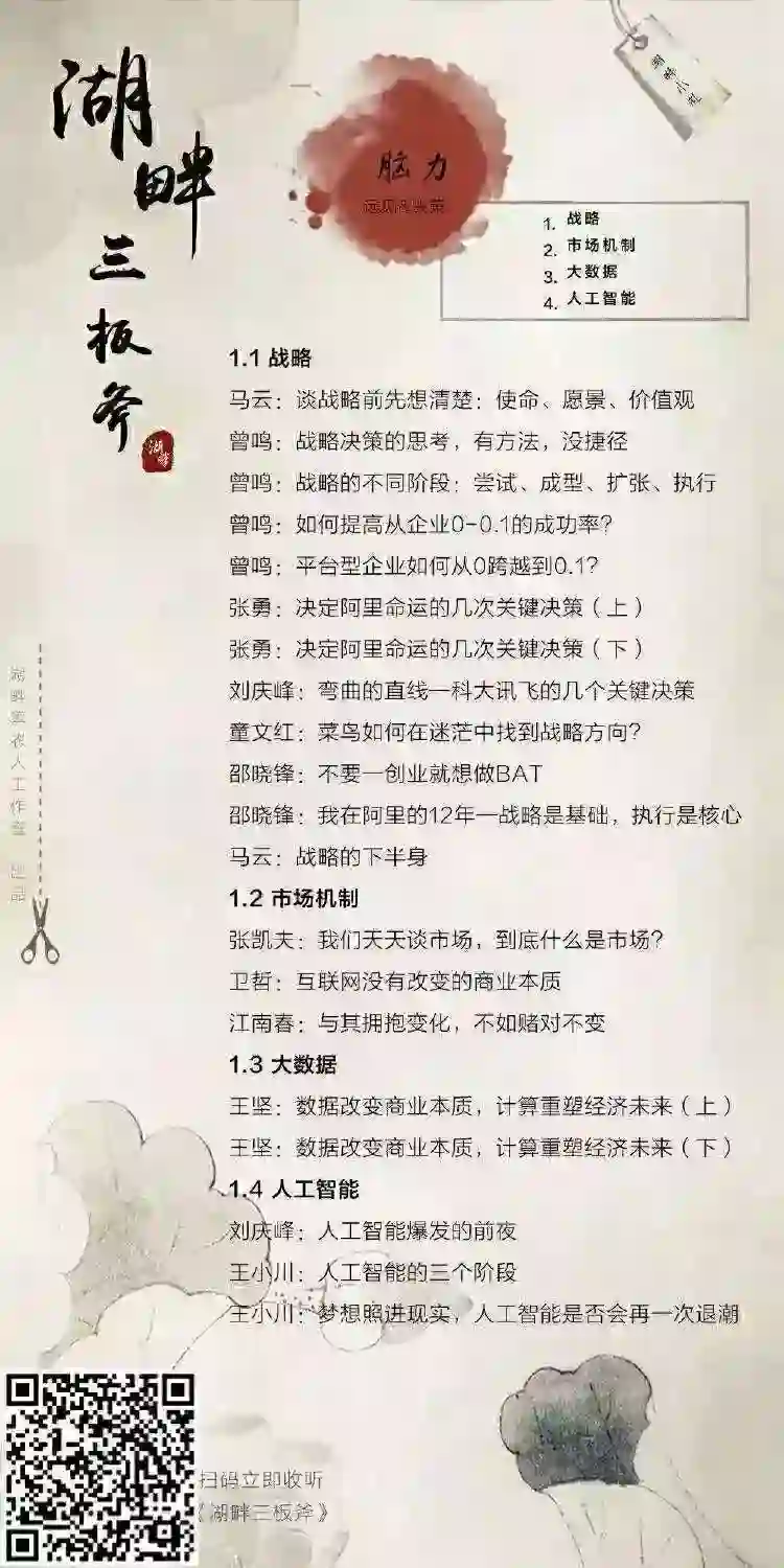 “湖畔三板斧”的系列音频课程:每周一期,每期 15 至 20 分钟,全年共 52 期。