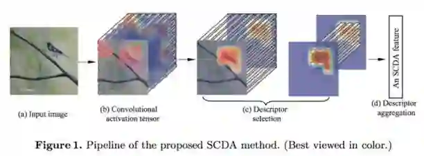 Selective Convolutional Descriptor Aggregation (SCDA) 是我们近期提出的首个基于深度学习的细粒度图像检索方法[9]。同其他深度学习框架下的图像检索工作一样,在SCDA中,细粒度图像作为输入送入pre-trained CNN模型得到卷积特征/全连接特征。区别于传统图像检索的深度学习方法,针对细粒度图像检索问题,我们发现卷积特征优于全连接层特征,同时创新性的提出要对卷积描述子进行选择。不过SCDA与之前提到的Mask-CNN的不同在于,在图像检索问题中,不仅没有精细的part annotation,就连图像级别标记都无从获取。这就要求算法在无监督条件下依然可以完成物体的定位,根据定位结果进行卷积特征描述子的选择。对保留下来的深度特征,分别做以平均和最大池化操作,之后级联组成最终的图像表示。