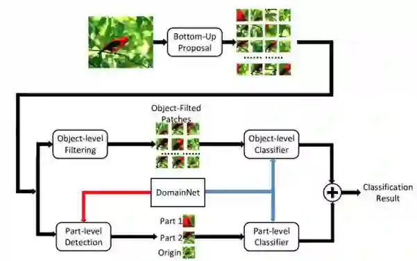 顾名思义,该模型主要关注两个不同层次的特征,分别是物体级别和部件级别信息。当然,该模型并不需要数据集提供这些标注信息,完全依赖于本身的算法来完成物体和局部区域的检测。其整体流程如下所示: