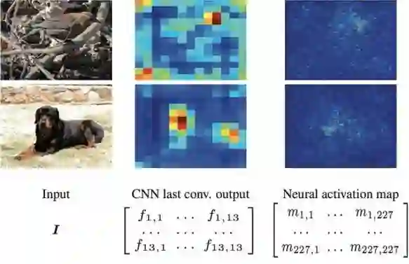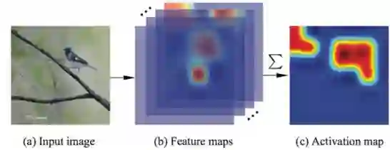 Constellations的方案是利用卷积网络特征本身产生一些关键点,再利用这些关键点来提取局部区域信息。对卷积特征进行可视化分析(如下图),发现一些响应比较强烈的区域恰好对应于原图中一些潜在的局部区域点。因此,卷积特征还可以被视为一种检测分数,响应值高的区域代表着原图中检测到的局部区域。不过,特征输出的分辨率与原图相差较大,很难对原图中的区域进行精确定位。受到前人工作的启发,作者采用的方法是通过计算梯度图来产生区域位置。