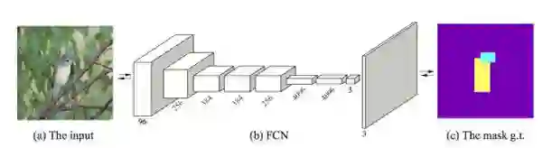 最近,我们也针对细粒度图像分类问题提出了名为Mask-CNN的模型。同上,该模型亦分为两个模块,第一是part localization,第二是全局和局部图像块的特征学习。需要指出的是,与前两个工作的不同在于,在Mask-CNN中,我们提出借助FCN学习一个部位分割模型(part-based segmentation model)。其真实标记是通过part annotation得到的头部和躯干部位的最小外接矩形,如下图(c)所示。在FCN中,part localization这一问题就转化为一个三分类分割问题,其中,一类为头部,一类为躯干,最后一类则是背景。