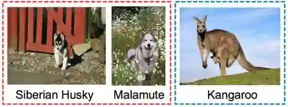 细粒度图像分析任务相对通用图像(general/generic images)任务的区别和难点在于其图像所属类别的粒度更为精细。下图为例,通用图像分类其任务诉求是将“袋鼠”和“狗”这两个物体大类(蓝色框和红色框中物体)分开,可见无论从样貌、形态等方面,二者还是能很容易被区分;而细粒度图像分类任务则要求对“狗”该类类别下细粒度的子类,即分别为“哈士奇”和“爱斯基摩犬”的图像分辨开来。正因同类别物种的不同子类往往仅在耳朵形状、毛色等细微处存在差异,可谓“差之毫厘,谬以千里”。不止对计算机,对普通人来说,细粒度图像任务的难度和挑战无疑也更为巨大。