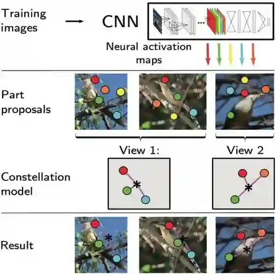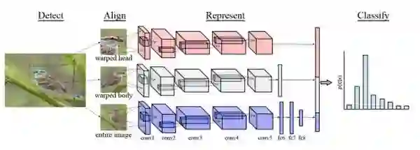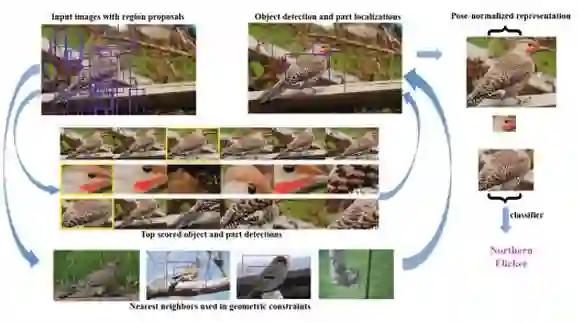 首先利用Selective Search等算法在细粒度图像中产生物体或物体部位可能出现的候选框(object proposal)。之后类似于R-CNN做物体检测的流程,借助细粒度图像中的object bounding box和part annotation可以训练出三个检测模型(detection model),一个对应细粒度物体级别检测,一个对应物体头部检测,另一个则对应躯干部位检测。然后,对三个检测模型得到的检测框加上位置几何约束,例如,头部和躯干的大体方位、以及位置偏移不能太离谱等。这样便可得到较理想的物体/部位检测结果(如图右上)。