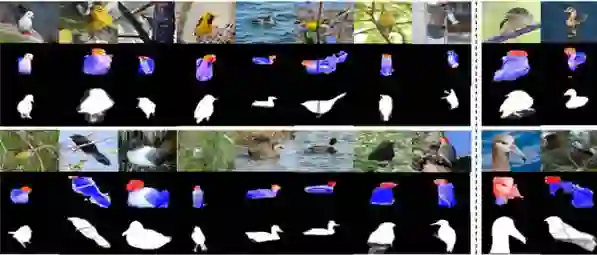 FCN训练完毕后,可以对测试集中的细粒度图像进行较精确地part定位,下图展示了一些定位效果图。可以发现,基于FCN的part定位方式可以对大多数细粒度图像进行较好的头部和躯干定位。同时,还能注意到,即使FCN的真实标记是粗糙的矩形框,但是其预测结果中针对part稍精细些的轮廓也能较好得到。在此,我们称预测得到的part分割结果为part mask。不过,对于一些复杂背景图像(如右下)part定位结果还有待提高。