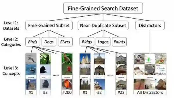 [8]在2015年首次提出细粒度图像“搜索”的概念,通过构造一个层次数据库将多种现有的细粒度图像数据集和传统图像检索(一般为场景)融合。在搜索时,先判断其隶属的大类,后进行细粒度检索。其所用特征仍然是人造图像特征(SIFT等),基于图像特征可以计算两图相似度,从而返回检索结果。
