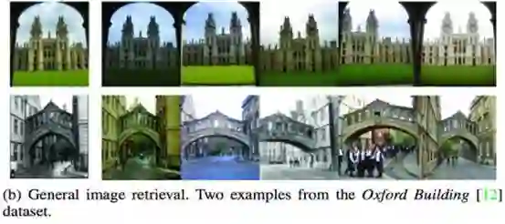 图像检索(image retrieval)按检索信息的形式,分为“以文搜图”(text-based)和“以图搜图”(image-based)。在此我们仅讨论以图搜图的做法。传统图像检索任务一般是检索类似复制的图像(near-duplicated images),如下图(b)所示。左侧单列为query图像,右侧为返回的正确检索结果。可以看到,传统图像检索图像是在不同光照不同时间下同一地点的图像,这类图像不会有形态、颜色、甚至是背景的差异。