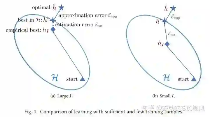 在小样本任务中,用小样本训练的模型很容易陷入对小样本的过拟合以及对目标任务的欠拟合,导致实际训练的模型h_I的表现与基于现有的特征和算法能训练的最优模型h*能达到的表现的差距无法通过训练和超参数调整有效的缩小,使模型的整体表现较差(基于足量样本训练的模型和基于小样本训练的模型分别见fig. 1的a和b)。