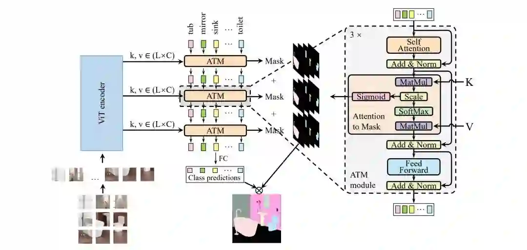 注意力机制中的Q与K的点乘操作用于计算两者之间的相似性,而在语义分割中同类区域特征应与其对应类别具有更大的相似性,上图则很好的说明了特征与类别之间的相似性。在Attention的基础上,简单的添加Sigmoid操作即可将相似性图转换为Mask。受此启发,作者设计了一种用于语义分割的ATM模块,并将其与朴素ViT的组合称之为SegViT。