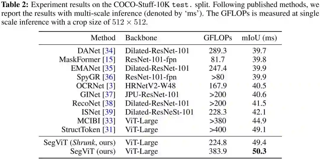 SegViT-Shrunk取得了55.1%mIoU,计算量相比SegViT-ViT节省40%。