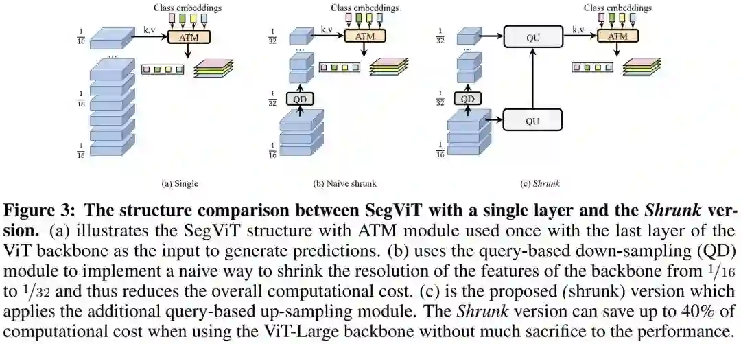 由于朴素ViT并不具备多阶段多尺度特征,FPN这种多尺度特征聚合方式就不再适用。那么,如何进行底层与高层特征聚合呢?作者基于ATM将ViT骨干不同位置的特征进行聚合并作为SegViT的Decoder模块。基于此,作者进一步引入了QD与QU构建了Shrunk版本的SegViT,在大幅降低计算量的同时保持同等性能。