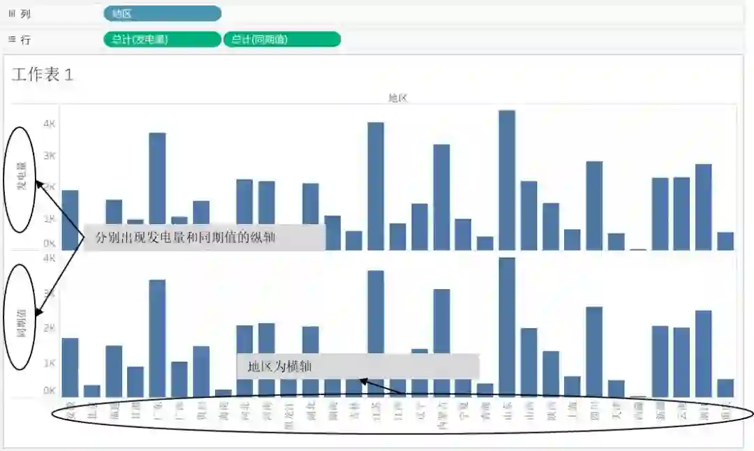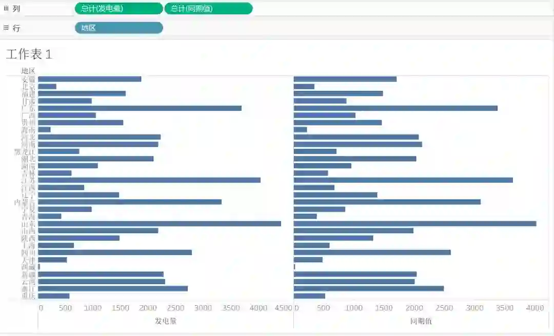 维度和度量都可以拖放到行功能区或列功能区,只是横轴、纵轴的显示信息会相应地改变,比如对于图10,我们可以单击工具栏上的,将行、列上的字段互换,这时“地区”显示在纵轴,横轴变成了“发电量”和“同期值”,如图11 所示。