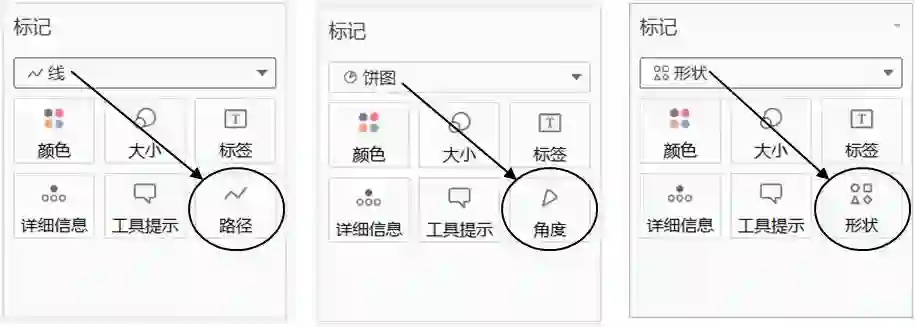此外还有3 个特殊按钮,只有在选择了对应的标记类型时,按钮才会显示出来。这3 个特殊按钮分别是线图对应的路径、饼图对应的角度和形状图形对应的形状,如图14 所示。
