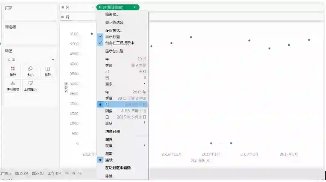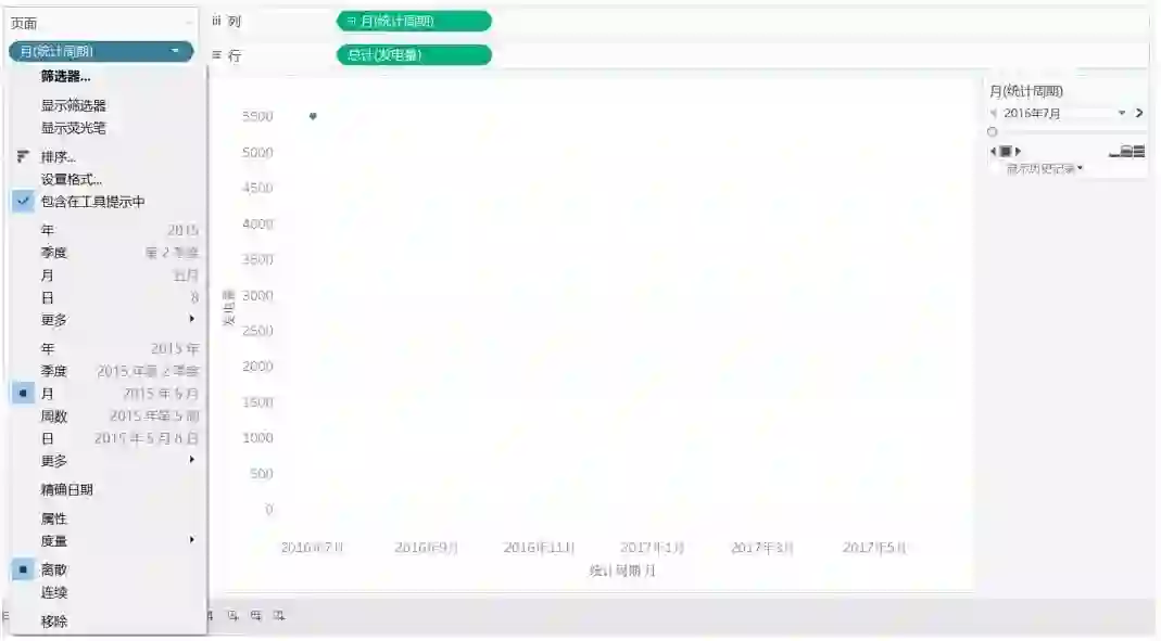 为了更好地展示页面功能,我们新建一个工作表,拖放字段“统计周期”到列,Tableau会默认“统计周期”为年,我们要手动转换为月(注意选择连续的日期),拖放“发电量”到行,标记类型选择圆,如图21 所示。