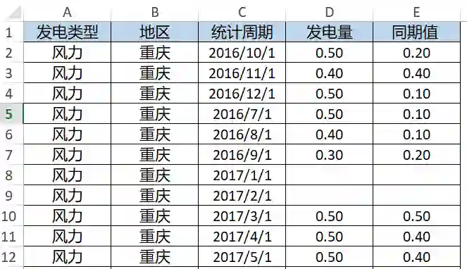 下面是一个从国家统计局网站获取的2016 年10 月~2017 年6 月的各地区、不同发电类型的当月发电量和去年同期发电量,数据存储为Excel 文件,如图1 所示。