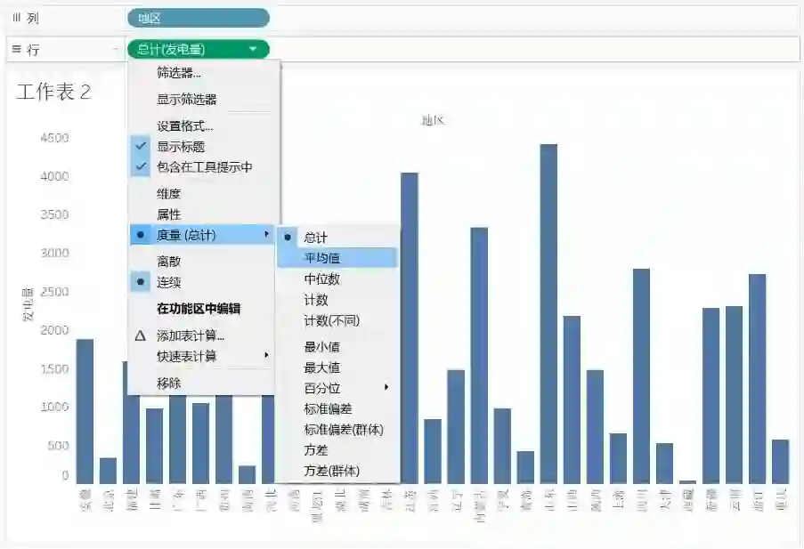 说明:Tableau 求平均值是对行数的平均。以上海为例,其平均值为发电量总和除以地区为上海的行数,在原数据中每个省有12 个月的发电量,每个月又分为5 个发电类型,则出现上海的总行数为12×5=60,即平均值=总计/60。