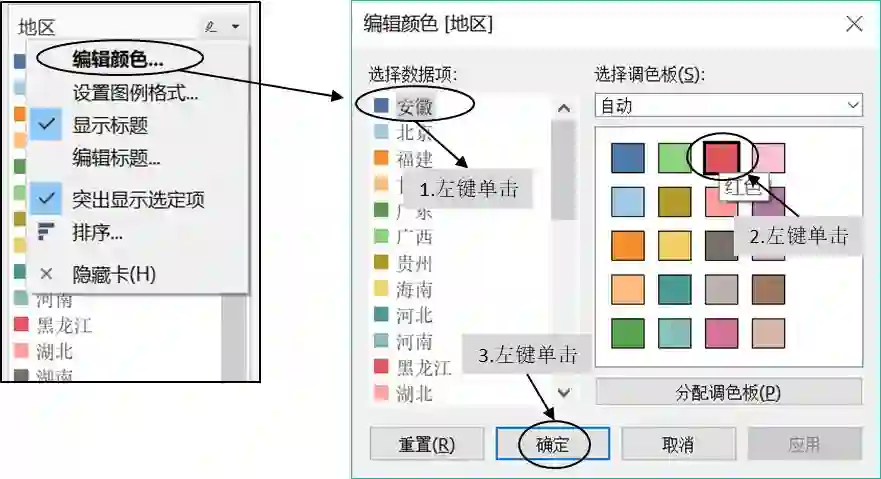 单击颜色图例右上角小箭头处,在弹出框中可以对颜色图例进行设置,如编辑标题、设置格式、排序等。单击选项“编辑颜色”,进入颜色编辑页面,可以对不同的区域自定义不同的颜色。比如要将安徽的蓝色改为红色,可选择“编辑颜色”进入颜色编辑页面。首先单击“安徽”,然后单击右侧选择调色板的红色,最后单击“确定”即可,如上图16 所示。