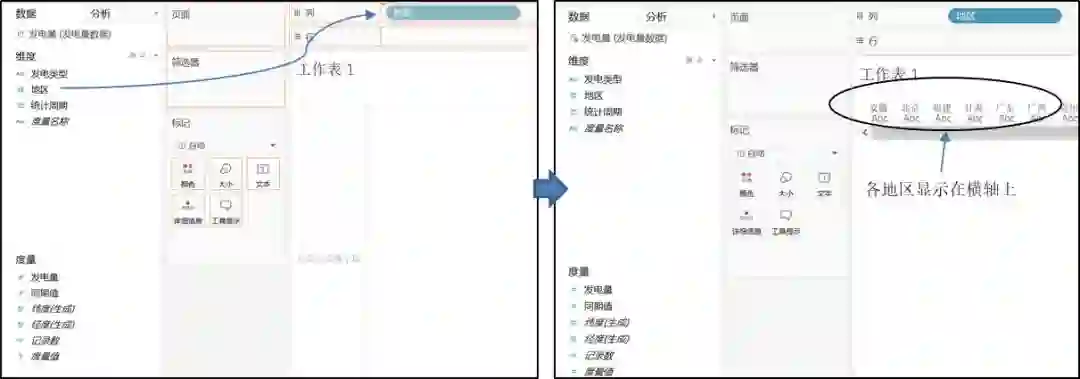 我们以制作各地区发电量柱形图为例。选定字段“地区”,用鼠标将其拖放到列功能区,这时横轴就按照各地区名称进行了分区,各地区成为了区标题,如图8 所示。