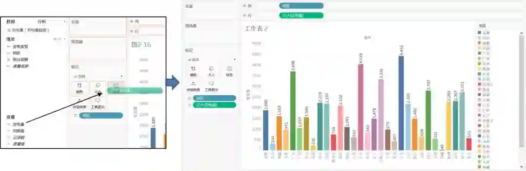 拖放“地区”到列功能区,拖放“发电量”到行功能区,完成最简单的显示各地区售电量累计值的柱形图。想让不同地区显示不同颜色,可利用标记卡中的颜色来完成,只需将字段“地区”拖放到颜色里即可(如图15 所示)。