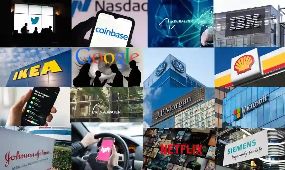 JPM (摩根大通)、GE (美国通用)、J&J (美国强生)、Netflix(奈飞)、Bridgewater( 桥水基金)、Galaxy Digital、IBM、IKEA (宜家)、Neuralink、Coinbase、Twitter (推特)、Tesla (特斯拉)、Microsoft (微软)、Apple (苹果)、Siemens (西门子)、Shell 壳牌、Pixar(皮克斯)、Intel(英特尔)等