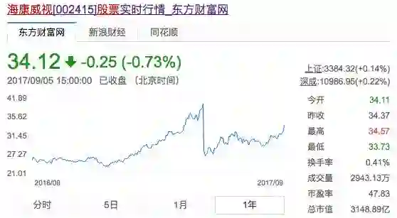 2017年9月6日海康威视的市值已经涨到3148亿元,市盈率47.83!