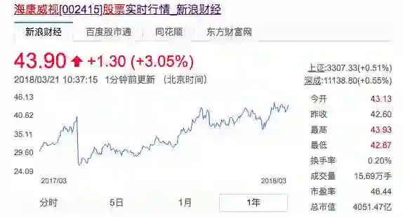 2018年3月21日海康威视的市值已经涨到4051亿元,市盈率46.44!
