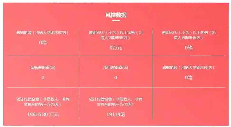 官网信披数据显示,截至2019年7月底,平台累计交易金额296.38亿元,借贷余额49.96亿元,当前出借人数据28031人,当前借款人数92853人。平台逾期相关数据均显示为0,累计代偿金额为1.96亿。