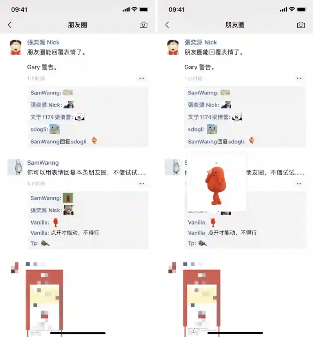 除了引用回复外,朋友圈评论支持表情包也是大家津津乐道的更新。随着这次更新,大家终于可以把「斗图」的战场扩展至朋友圈评论了。在朋友圈评论的表情包默认会以缩略图的形式呈现,点击后即可放大并播放动画。