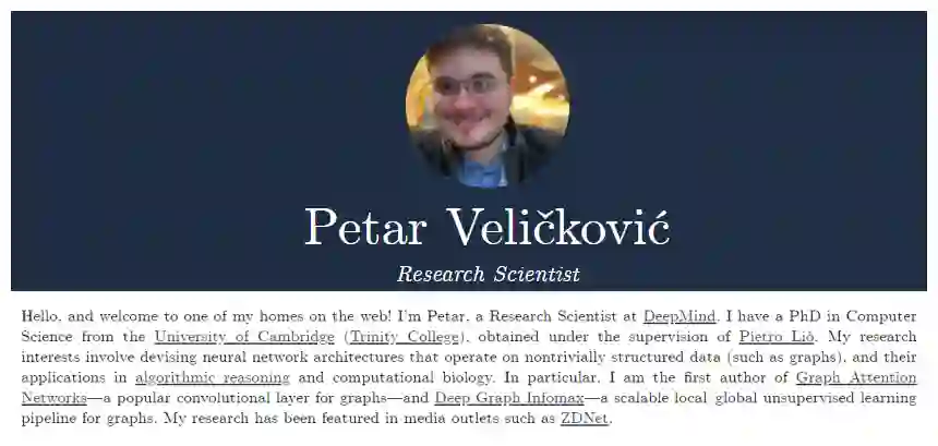 本文作者 Petar Veličković现为 DeepMind 研究科学家,在剑桥大学三一学院取得计算机科学博士学位,其导师为 Pietro Liò。他的研究兴趣是设计能够在非平凡结构数据(如图)上运算的神经网络架构,以及这些架构在算法推理和计算生物学领域的应用。