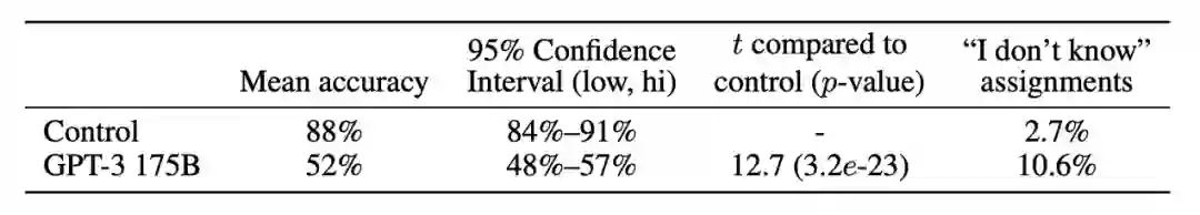 人类对 GPT-3 175B 模型生成的约 500 词文章的判断准确率为 52%,不过相比于 GPT-3 control 模型(没有语境和不断增加的输出随机性且只具备 1.6 亿参数的模型),GPT-3 175B 生成的文本质量要高得多。