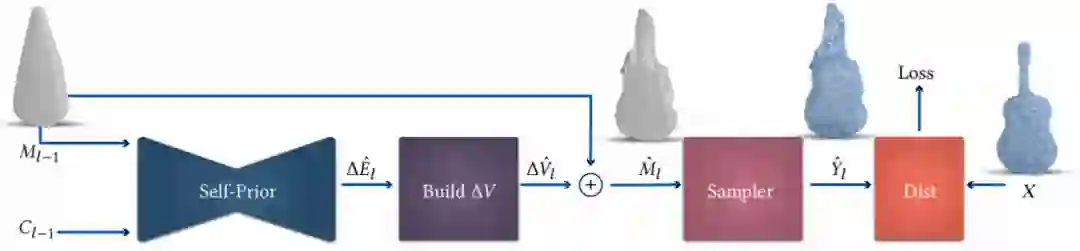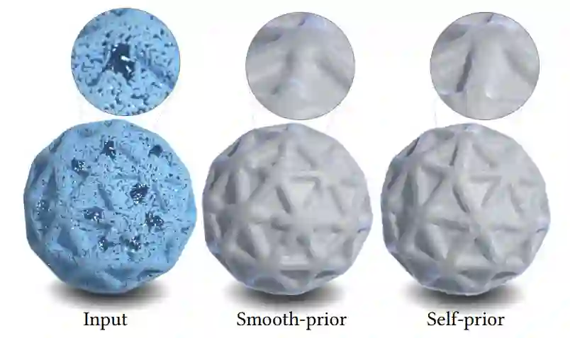 。与之前方法需指定一个用于编码期望形状的 prior 不同,该研究使用输入点云来自动生成 prior,并称其为 self-prior。该 self-prior 将重复出现的几何形状由单一形状封装在深度神经网络的权重之中。