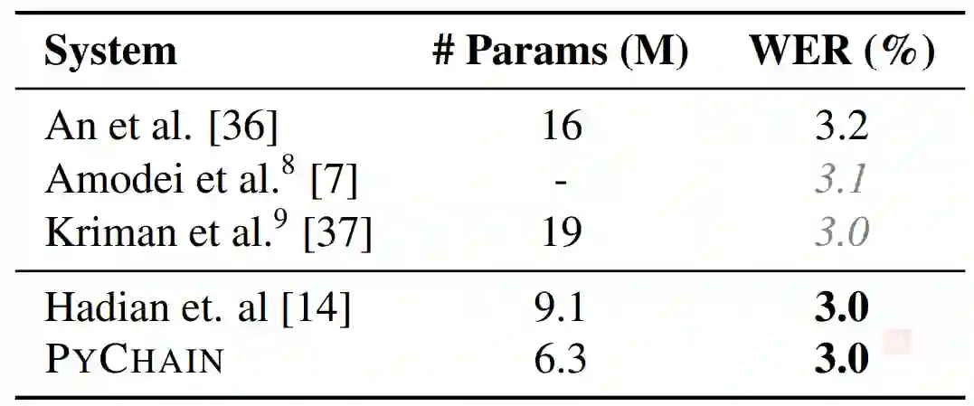 在 WSJ 数据集上的实验表明,利用简单的神经网络和常用的机器学习方法,PyChain 可以实现媲美 Kaldi 甚至优于其他端到端 ASR 系统的结果。