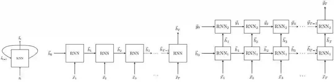 左:单个循环神经网络单元;中:RNN 单元的扩展,以执行反向传播;右:堆叠两个 RNN 单元,得到「深度」RNN。