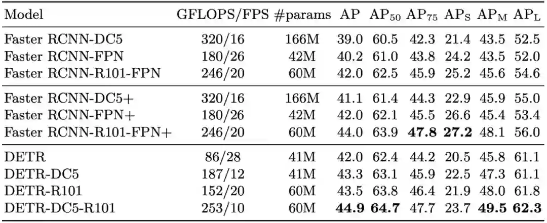 具体来说,研究者在 COCO 目标检测数据集上将 DETR 与 Faster R-CNN 基线方法进行了对比,结果发现 DETR 在大型目标上的检测性能要优于 Faster R-CNN,但在小目标的检测上性能不如后者,这为今后 DETR 的改进提供了新的方向。