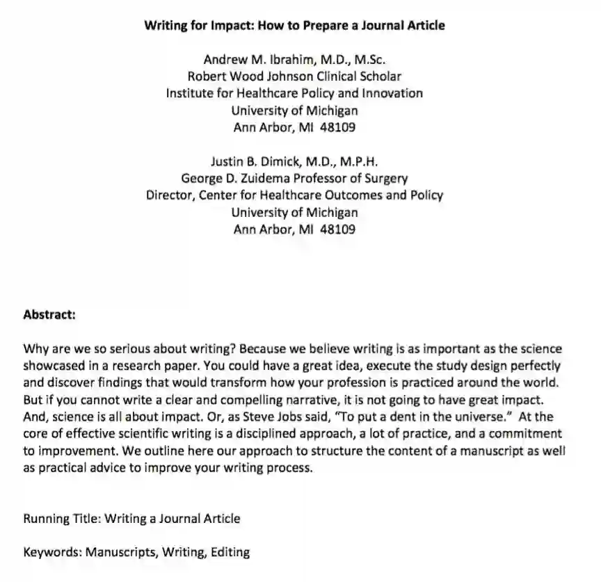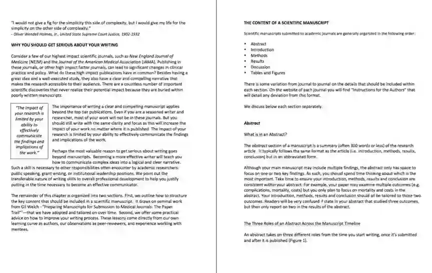 为什么我们对写作这么认真?因为我们相信写作和科学在研究展示在论文中一样重要。你可以有一个伟大的想法,完美地执行研究设计,并发现结果将改变你的职业在世界各地的实践方式。但是,如果你不能写出一个清晰而令人信服的叙述,它将不会有很大的影响。科学是关于影响的,science is all about impact。或者,就像史蒂夫·乔布斯所说的,“在宇宙中留下一个凹痕。”有效的科学写作的核心是一种自律的方法,大量的实践,以及对改进的承诺。我们在这里概述了我们构建手稿内容的方法,以及改进你的写作过程的实用建议。