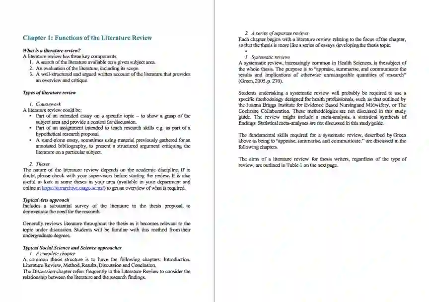 许多学科的研究生,特别是社会科学等,需要能够写一篇文献综述。无论是写一篇简短的综述作为作业的一部分,还是在一篇博士论文中写一个完整的章节,学生们都会发现很难将文献搜索中发现的大量不同材料转化为一场组织良好的批判性讨论。
