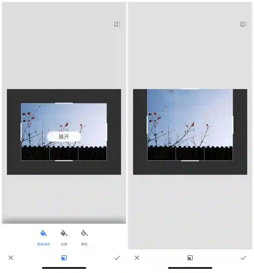 Snapseed 本身的修复功能平平无奇,但在它的工具列表中有一个「展开」工具,这一工具不仅能制造黑白双色边框,还可以通过「智能填色」自行创造画面内容。