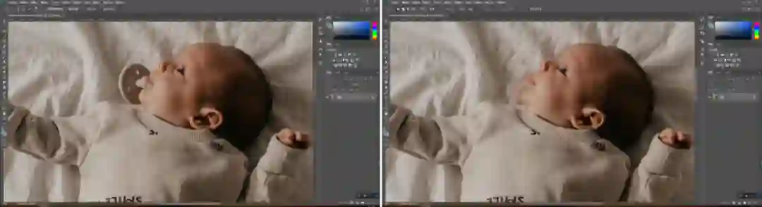 同样以处理桌面端这张婴儿照中的「奶嘴」为例,TouchRetouch 完整保留了婴儿嘴部的边缘轮廓,虽然细看还是漏出了一条深色的边缘线,但总体效果非常不错。而 Pixelmator Photo 的表现只能用「惨不忍睹」来形容了,不仅长出了另一块下巴区域,衣服上的罗纹、床单和下巴三者完全糊在了一起。这样的对比表现,谁看了不感叹一句「TouchRetouch YYDS」。