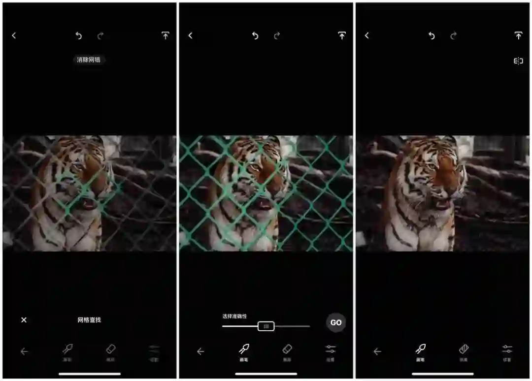 不过这一切都是在「理想」状态下,由于网格检测依靠的仍然是对线条的识别,这就要求网格线不能太粗也不能太虚,像木栅栏那种「粗壮」的遮挡,又或是长焦虚化的网格,都不在它的处理范畴内。网格的边缘也需要比较规整,如果处理对象是带刺的铁丝网,你会尴尬地发现网没了,刺都在。此外,网格检测和对象感知一样,也需与背景有较大反差应用才可正确识别,不然就会被自动忽略。最后,就算正确识别所有网格,但若网格占比面积太大,最终效果依然不太行。总的来说,可用场景非常有限,还需要大量优化才堪重任。