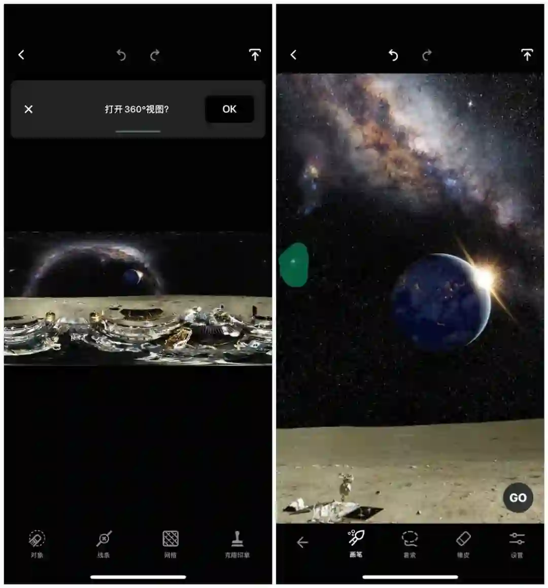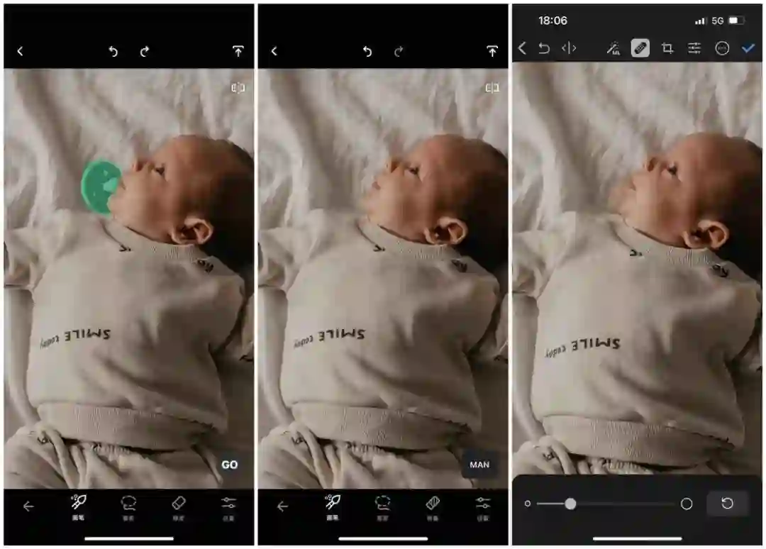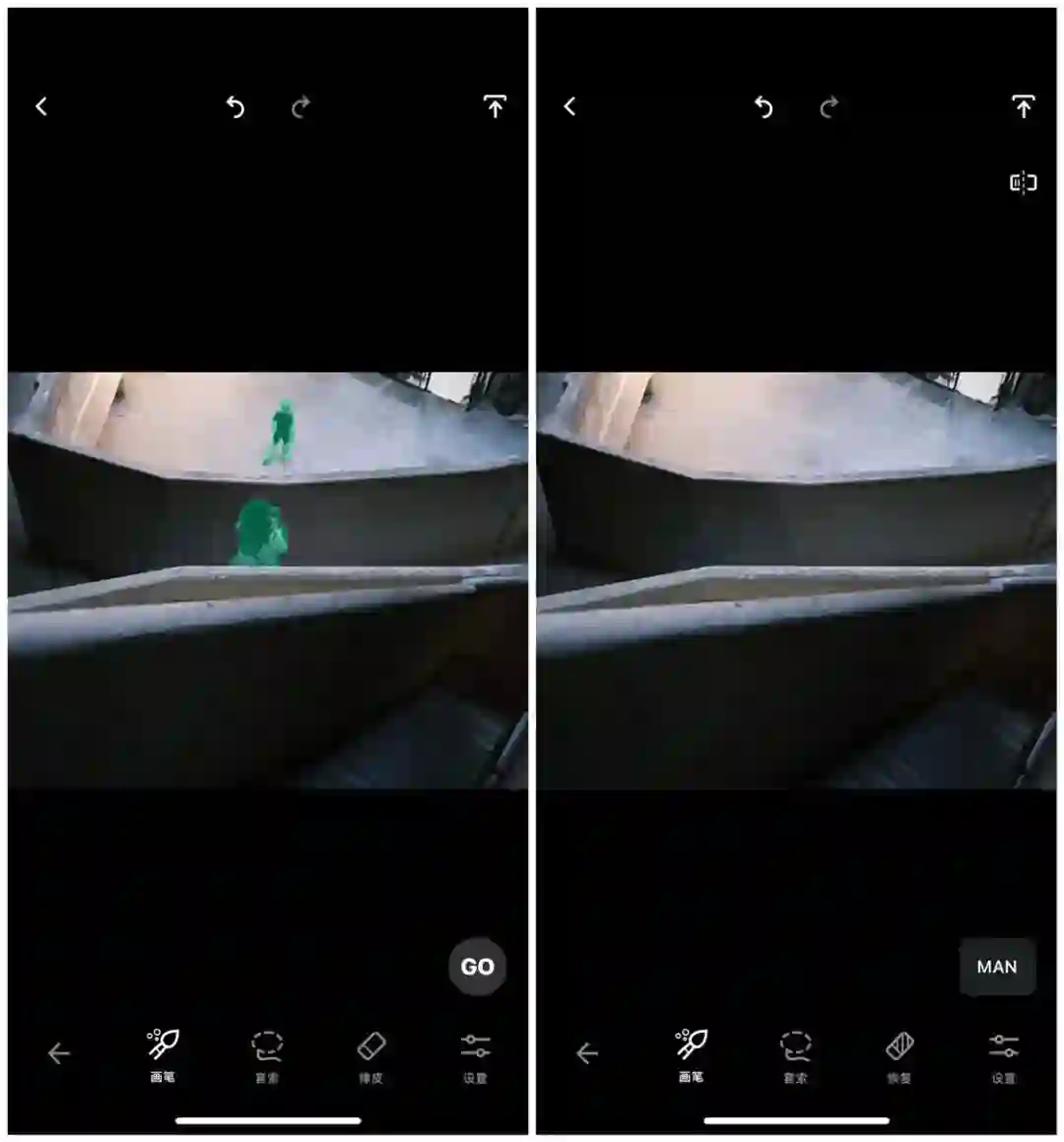 新版在右下角增设了「AUTO / MAN」的切换键,自动模式下就是原本的快速修复,手动模式下就是原本的删除物体。两者操作方法大同小异,在手工模式下,通过画笔或者套索、涂抹或者圈定需要删除的物体后点击「GO」即可进行修复;在自动模式下,修复则会自动生效。4.0 中的「噪点消除器」也保留了下来,在对象删除功能中,无论自动还是手动,手指单点一个位置都会自动处理对应位置的图案。