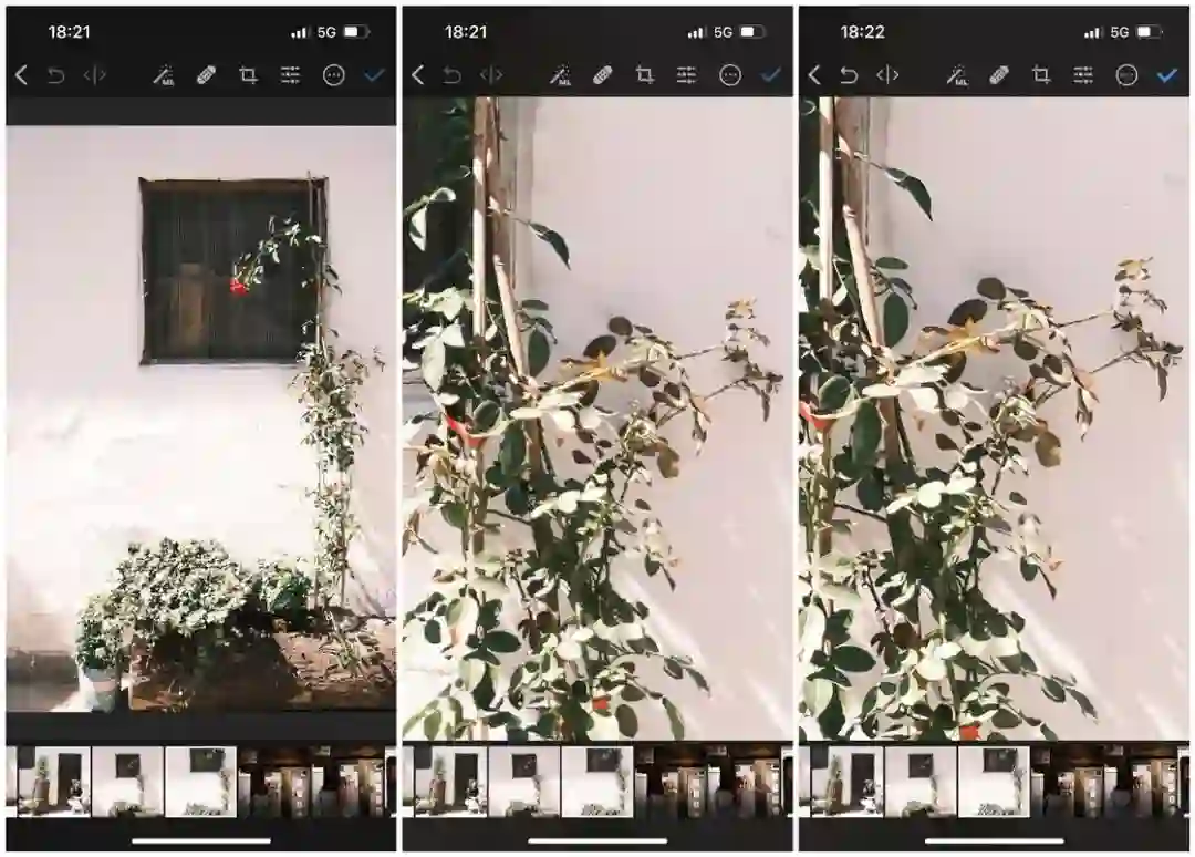 由于 TouchRetouch 此前一直为深色主题,所以双色主题的加入主要在于提升颜值和与系统的契合程度。而选图界面的变化,则更偏向功能性了。新版的选图界面支持 3 种不同的预览模式,点击左下角的切换按钮会在正方形和原始比例两种预览模式下切换,如果你在某一素材上使用双指打开手势还可以切换为大图预览模式。正方形预览是大多修图应用默认的拣选模式,整齐划一、突出中心元素又充分利用屏幕空间,可以让人更快速地找到素材。