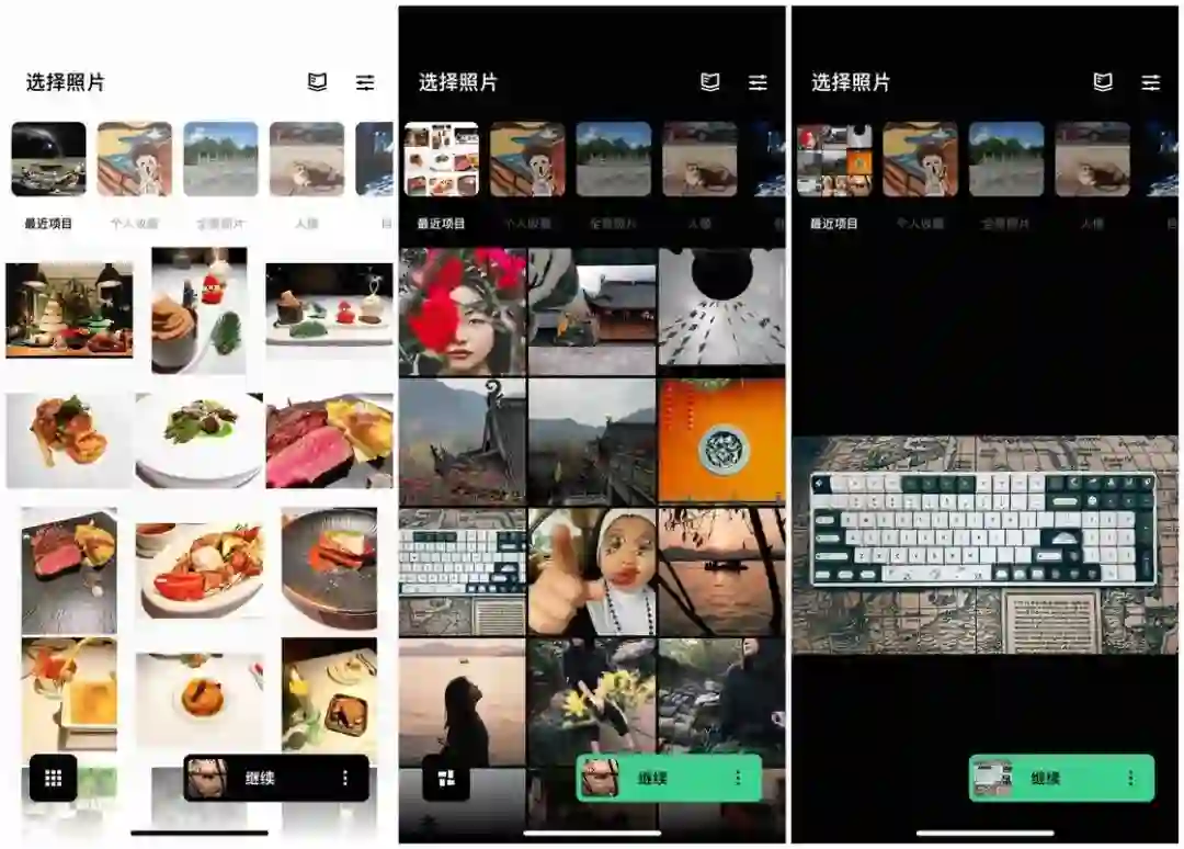 此外,原本在启动页展现的历史操作也集成在选图界面,你可以点击右下角长方形按钮快速回到前一次图片编辑中,也可以在此快速导出或放弃更改,算是在一定程度上提升效率。